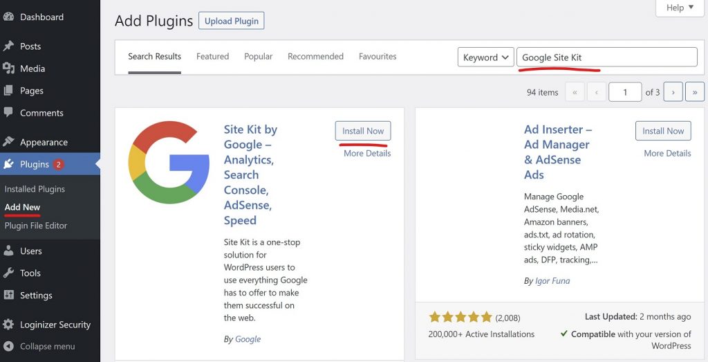 Click on Add New, type in ‘Google Site Kit’ into the Keyword search field and then once Site Kit by Google appears, select Install Now. Note, ensure that the plugin is by Google.