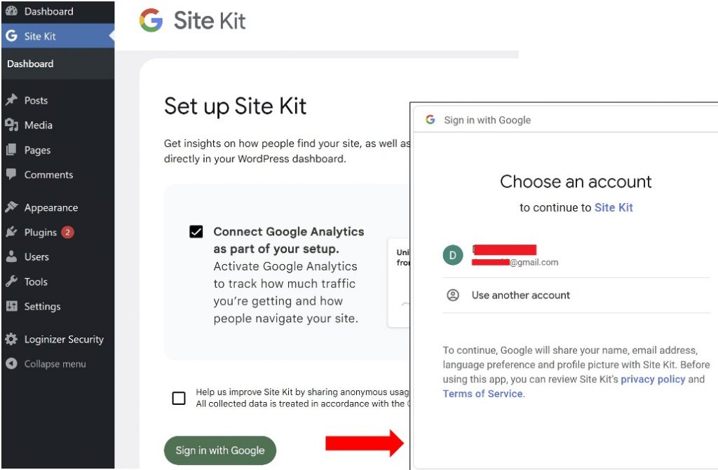 3. The window will then display Set up Site Kit. Tick the ‘Connect Google Analytics..’ and then sign in with Google. Note, you do need a Google account to use Google Analytics and Site Kit. Anonymous usage data is optional.