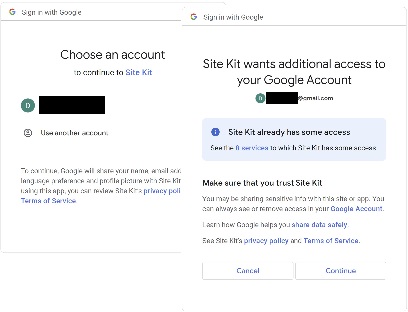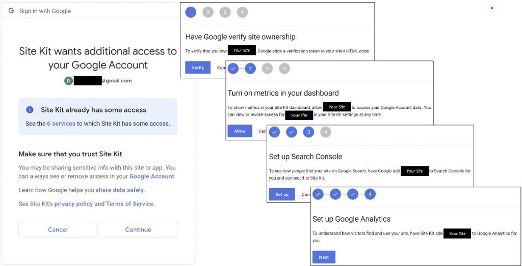 4. Site Kit will request further access. Follow the prompts to continue, noting that your website name is correctly identified in the prompts. Google will now set up access.