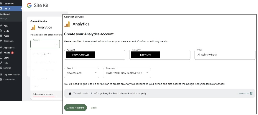 5. Once access setup has finished, you will then need to create a Google Analytics account for the website. The Account and Property fields will be prepopulated.
