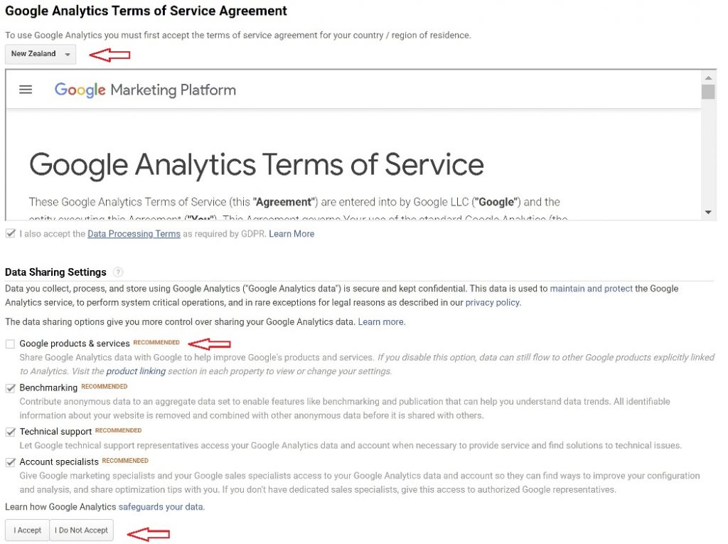7. The Google Analytics Terms of Service Agreement will then be displayed. Change the country to your location, and select the Data Sharing settings which you require. Note you can share Google Analytics data with the mothership and it requires an acceptance of additional terms and conditions.