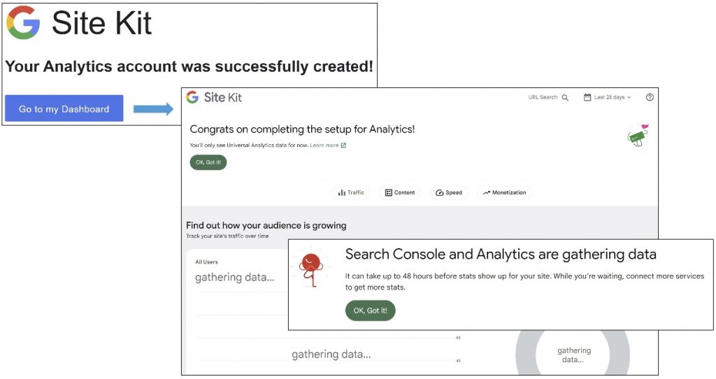 8. The Analytics account should be created and the Analytics setup completed. You can then click on ‘Ok, got it’ and then a message will be displayed saying that data gathering has started.