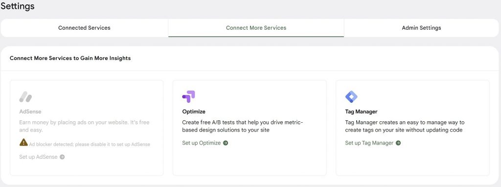 10. Across the tabs, you can Connect More Services such as Adsense or Tag Manager.